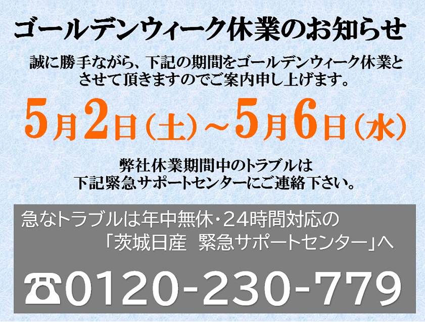こんにちは、古河店です誠に勝手ながら明日から6日までGW休暇頂きますご迷惑お掛けします。お願いいたします緊急時にはサポートセンターへ連絡お願いします0120-230...