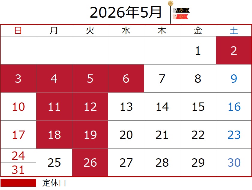 5月の定休日ご案内になりますご迷惑お掛けしますが、宜しくお願いします