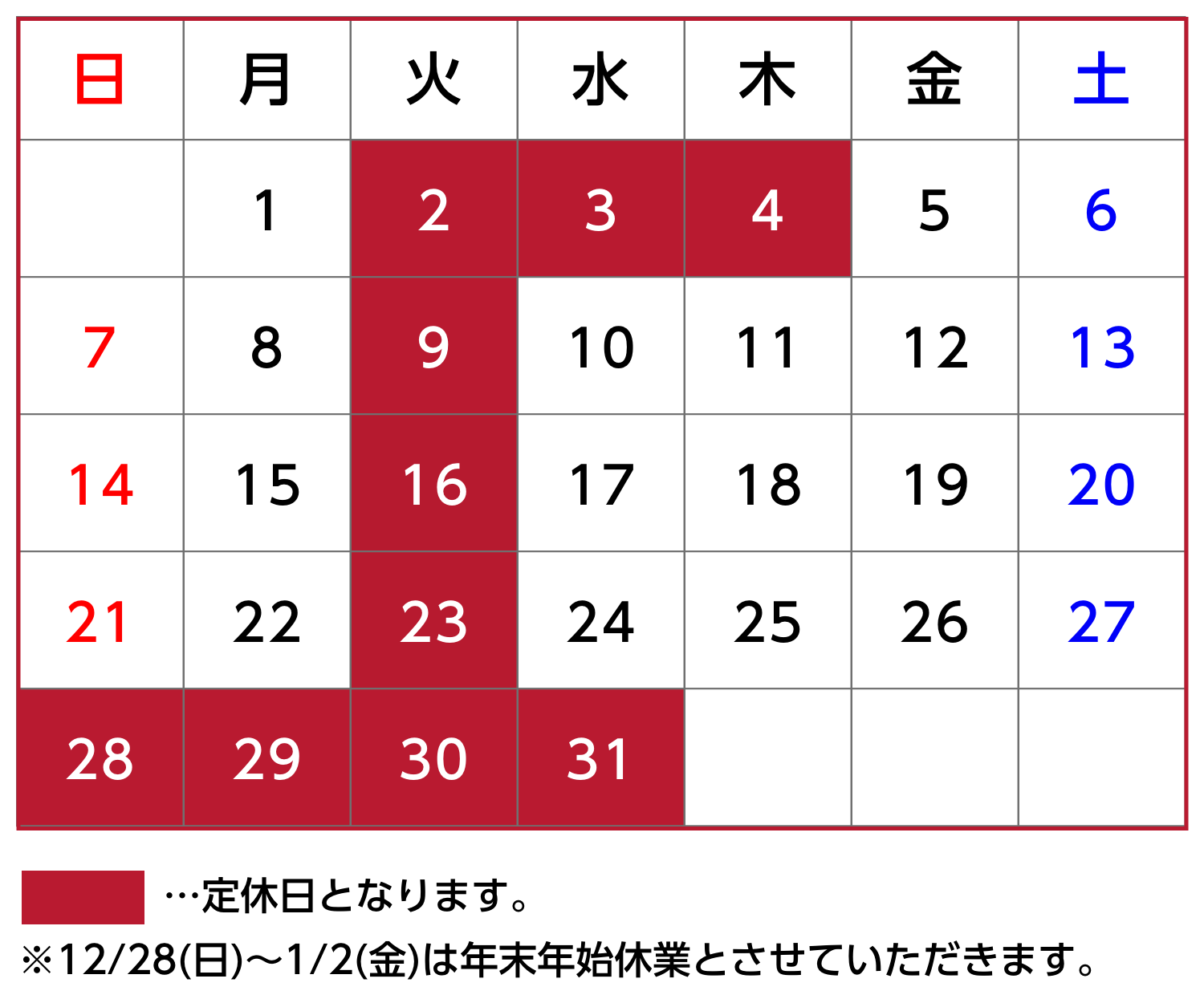 12月の定休日のお知らせ